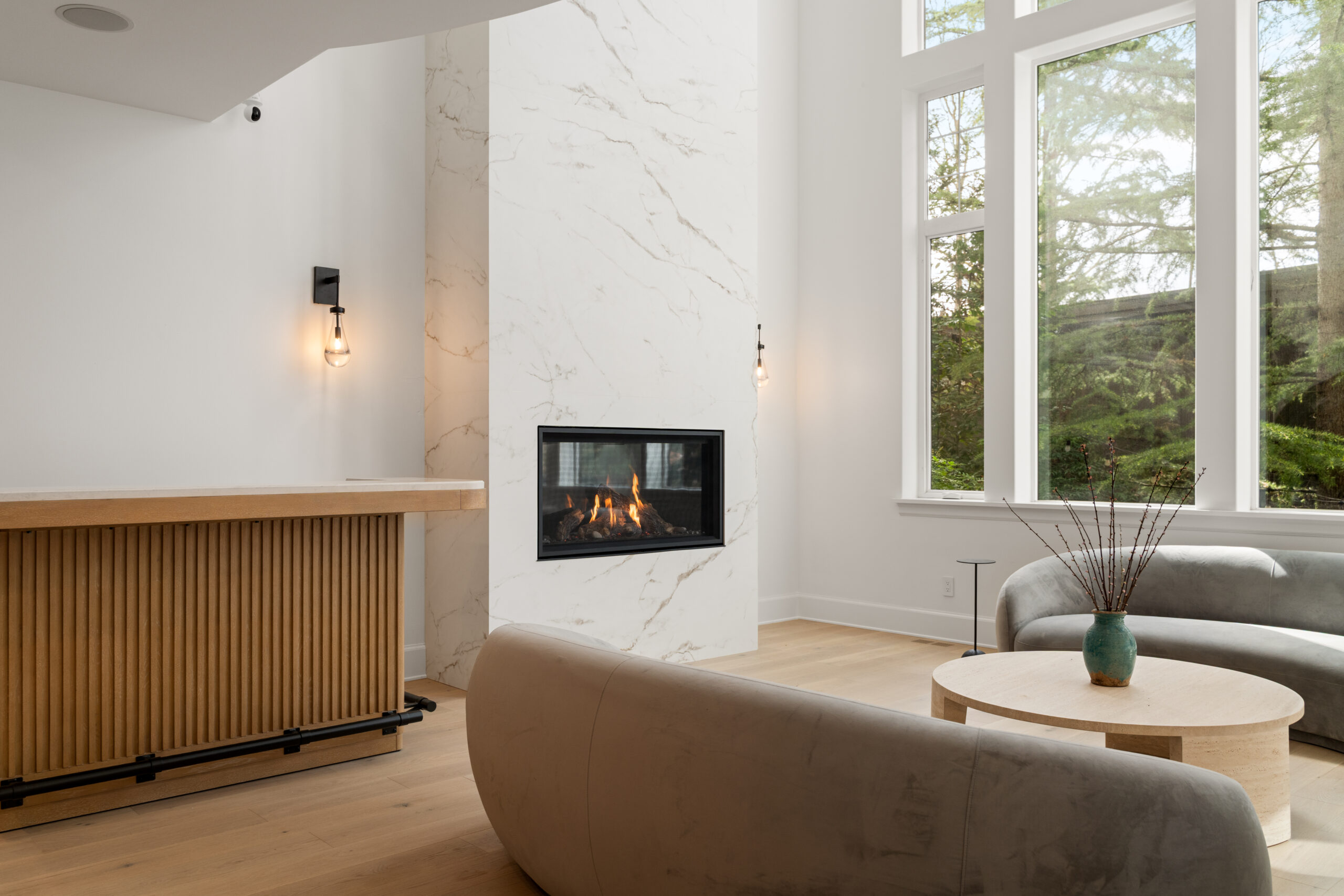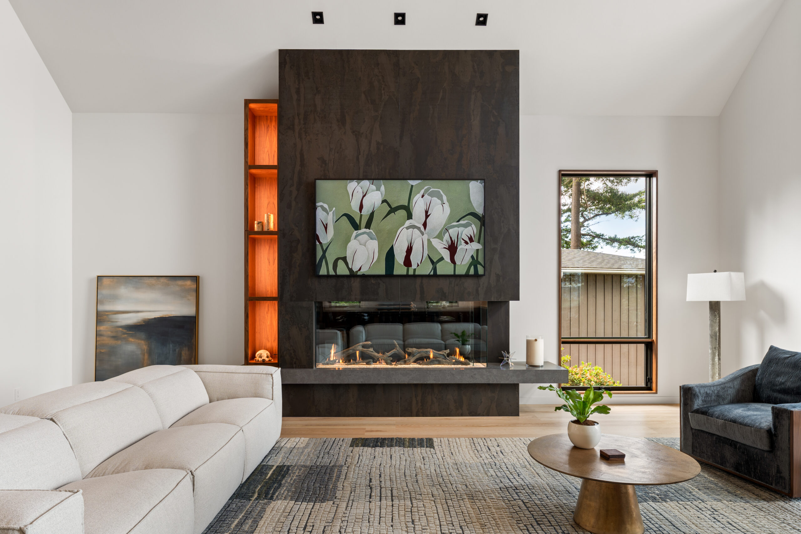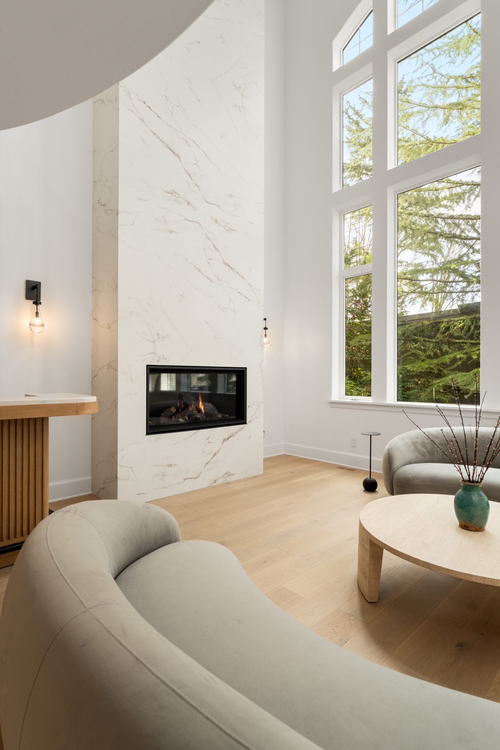 Project Spotlight: Bellevue Modern Fireplace Large-format porcelain panel installation with mitered returns and tight alignment. Completed for a Seattle design–build firm.