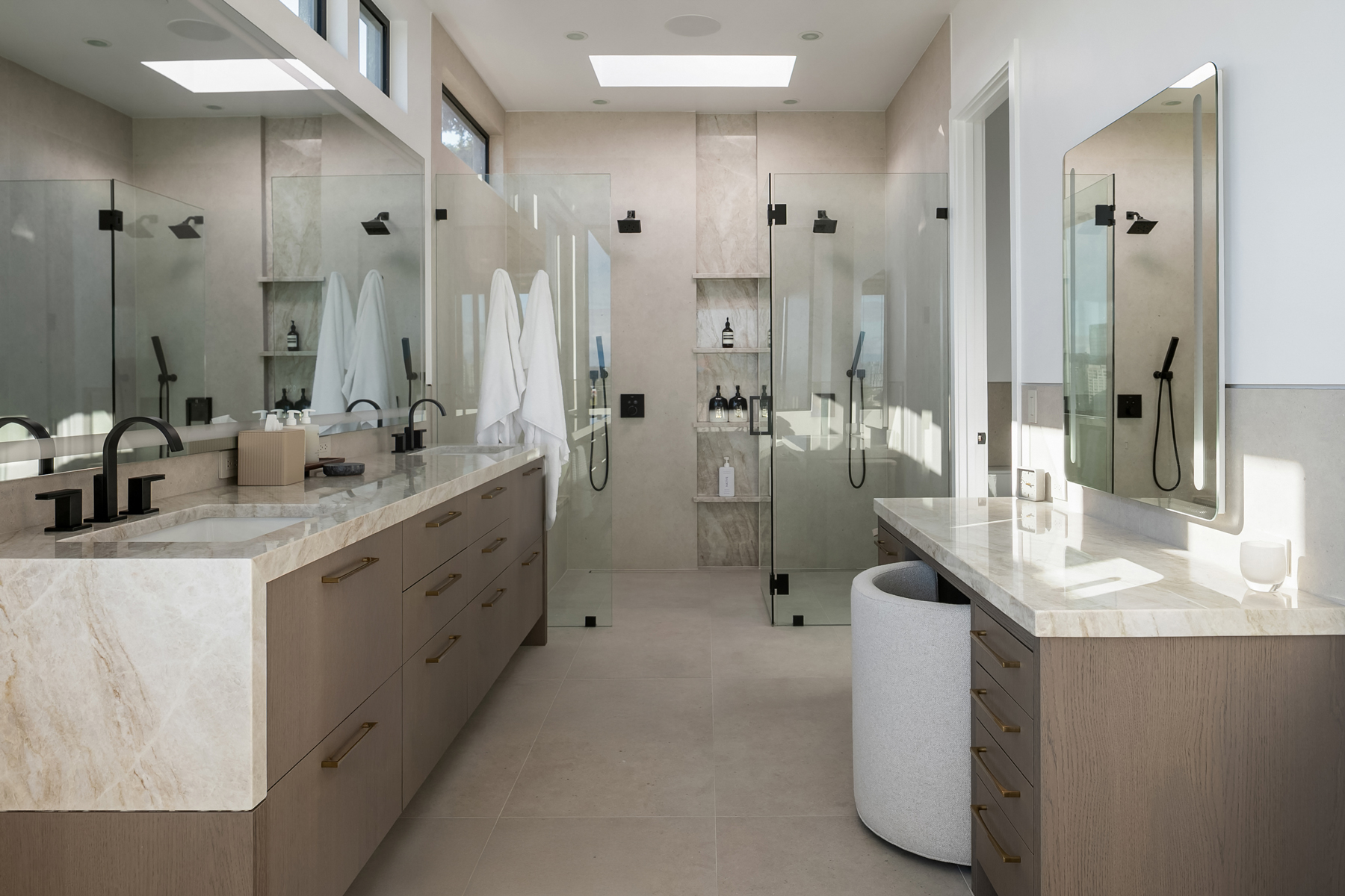 Mitered waterfalls. Integrated sinks. Fluted walls. Porcelain shower walls. The precision work that defines a space.