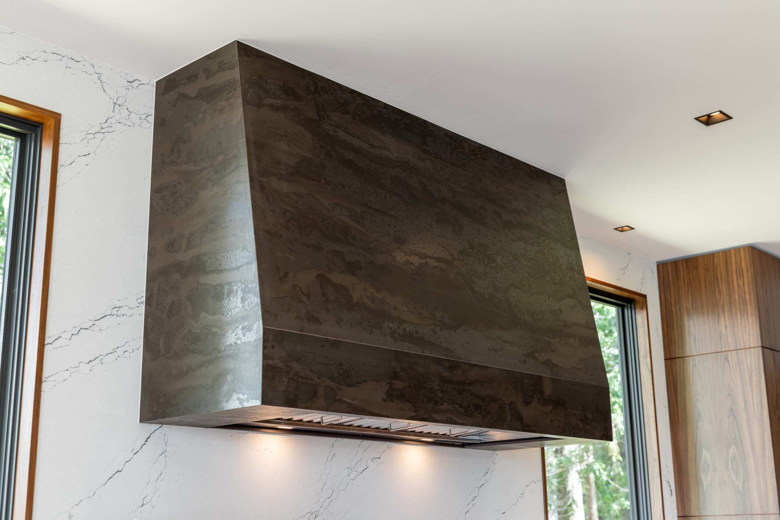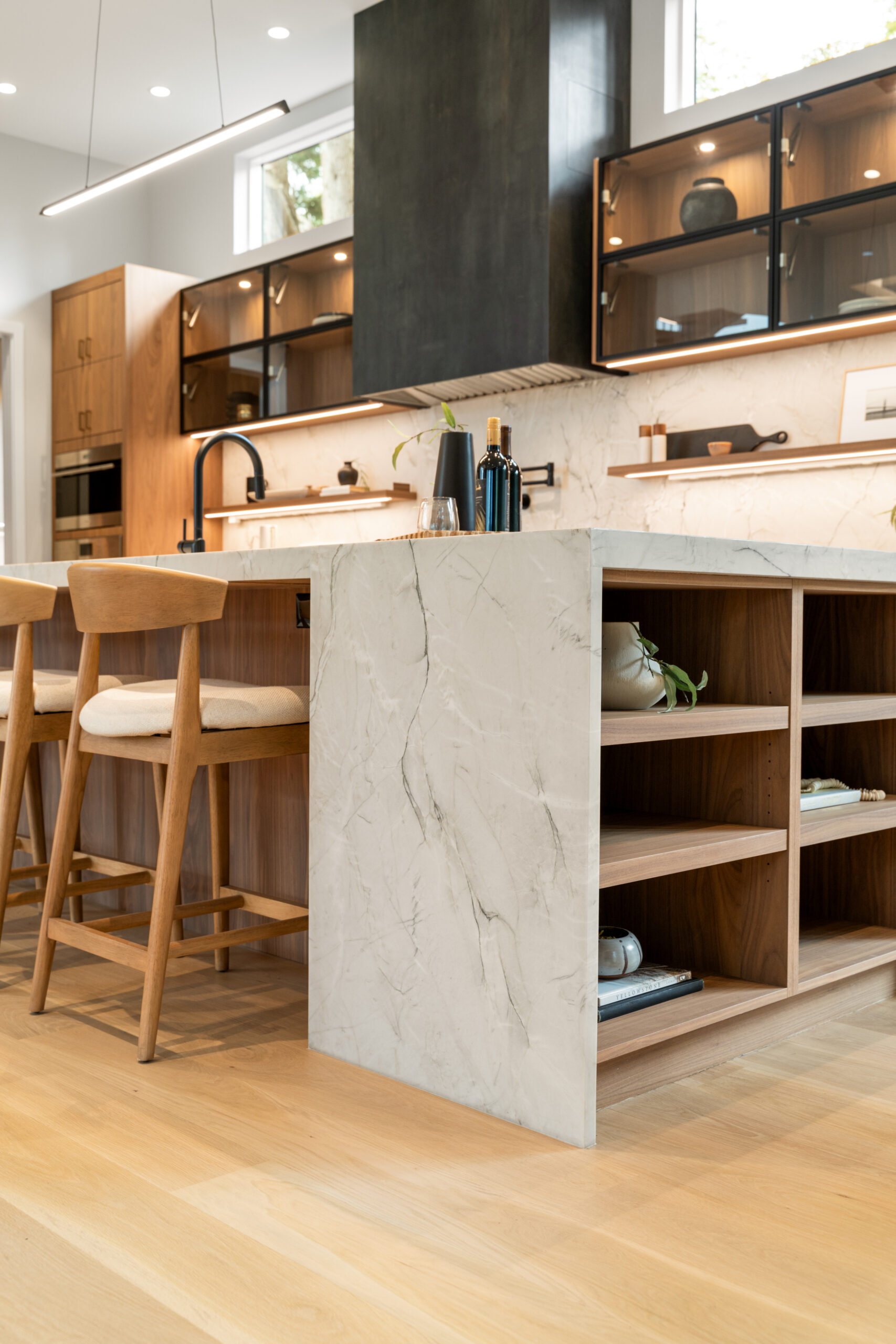 Fluted islands. Wrapped hoods. Floating shelves. Complex fabrication, installed with precision.